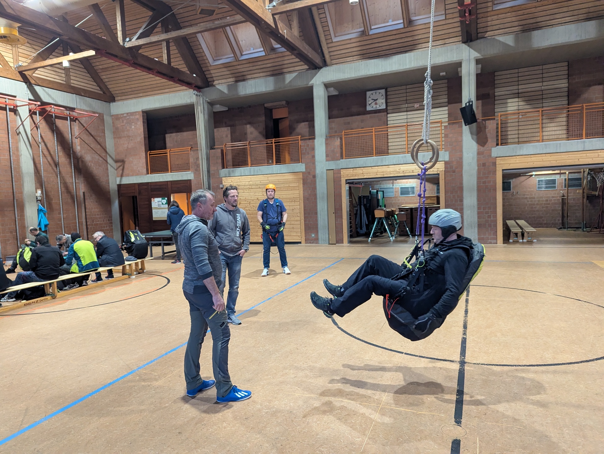 Samstagmorgen um 9 Uhr ging’s also los und die Kollegen vom Sky-Team gaben zuerst eine Einführung in wichtige theoretischen Grundlagen. Danach schleuderten sie die Teilnehmer ordentlich im aufgehängten Gurtzeug herum, die dann ihre Rettungsgeräte werfen konnten.